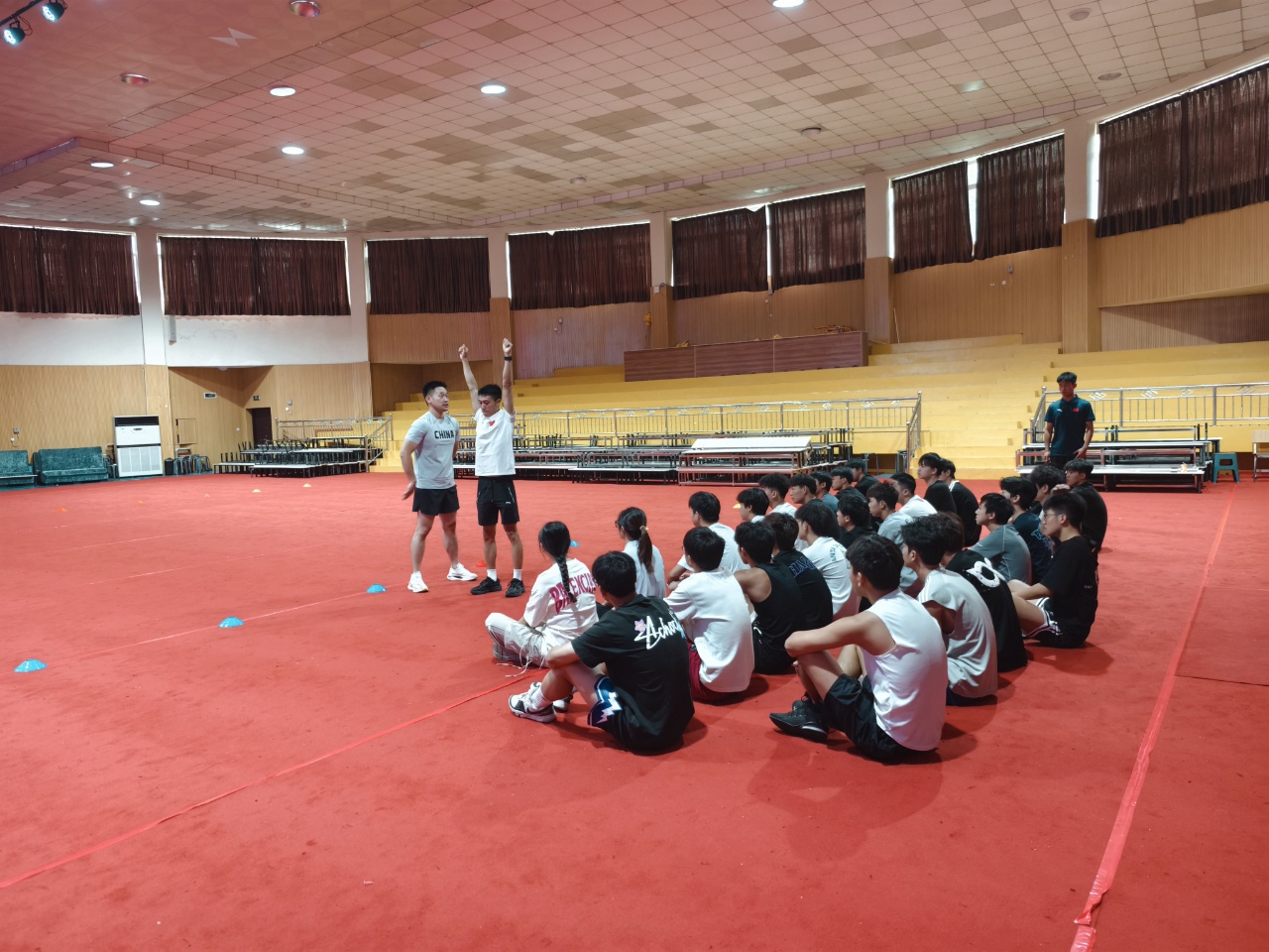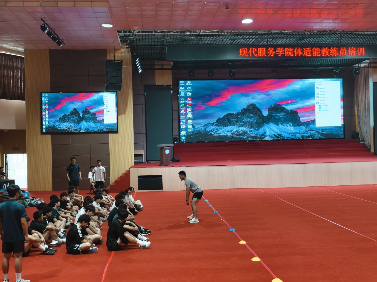在实操环节,学员们分组进行热身、训练、拉伸等环节的教学设计与展示。讲师详细讲解各环节理论知识,并指导学员结合儿童身体特点,遵循FITT原则,科学编排训练内容。