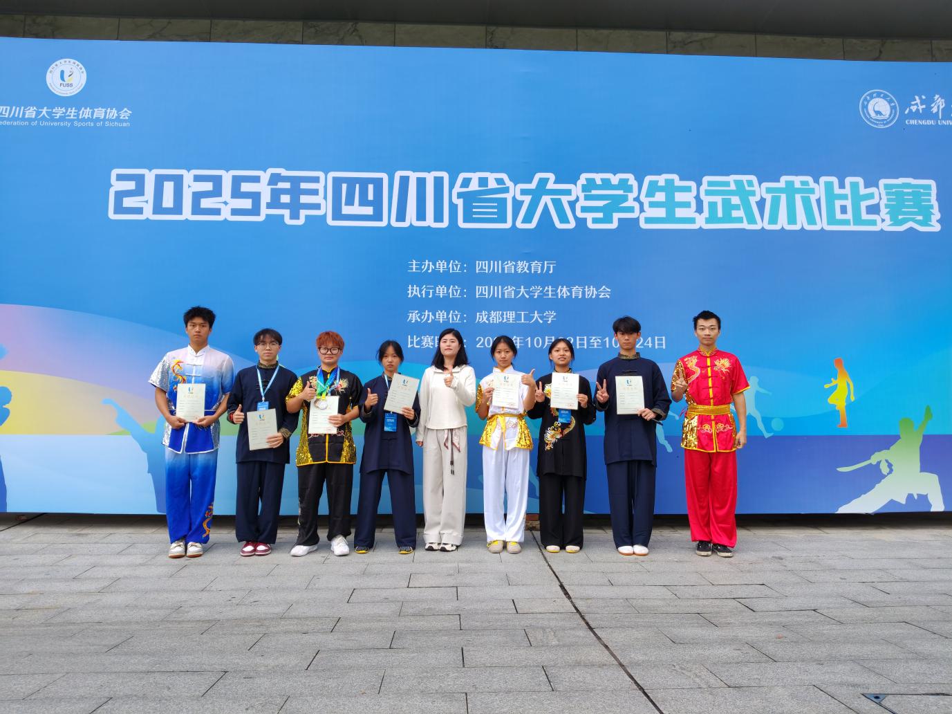 yl7703永利集团武术代表队由yl7703永利集团组建,在领队张自强、指导教练张良与邹光辉的共同带领下,8 名学子鲁清福、李忠樑、贺金枫、郭伦豪、邓苑、雷波、鲁文熙、唐子琴怀揣对武术的热爱与执着出征赛场。他们奋勇拼搏,凭借扎实的功底、出色的临场发挥和昂扬的精神面貌屡创佳绩,最终斩获拳类项目 1 个第三名、1 个第四名、2 个第五名、1 个第六名,器械类项目 1 个第二名、1 个第八名的优异成绩,不仅为公司赢得荣光,更充分展现了城院学子积极向上的青春风采。